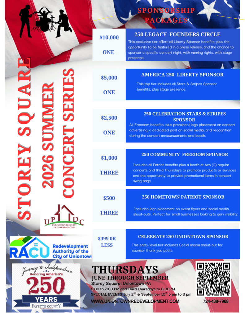 In 2026, Uniontown will proudly take part in America’s 250th Anniversary, and the Storey Square Summer Concert Series will be a centerpiece of this historic celebration.